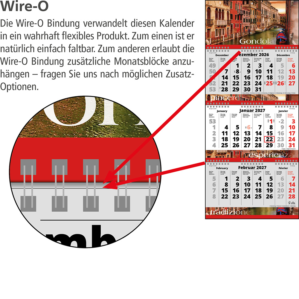 Das Klarsicht-Trägerband ist durch das Fenster (rot) des Datumsweisers hindurch gefädelt, um ein Abfallen des Fensters zu vermeiden. Der Datumsweiser ist um den Kalender umgelegt. Der Kalender ist für den Versand faltbar. Die Kalenderblöcke sind durch eine Wire-O-Drahtbindung miteinander verbunden. |