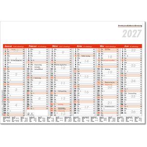 einsprachiges Kalendarium Angabe der Kalenderwochen 7 Spalten pro Woche und 2-Monatsübersicht Tageszählung auf- und absteigend Stundeneinteilung, oberes Blatt Platz für Notizen, Jahresübersichten, Ferientermine D/A/CH und internationale Feiertage |