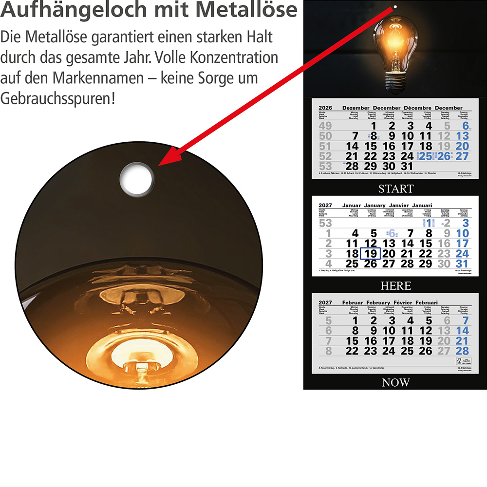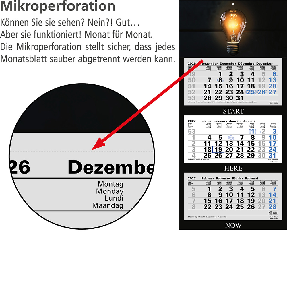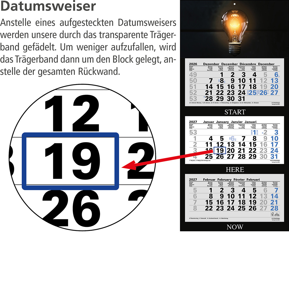 Das Klarsicht-Trägerband ist durch das Fenster (blau) des Datumsweisers hindurchgefädelt, um ein Abfallen des Fensters zu vermeiden. Der Datumsweiser ist um den Monatsblock (nicht den gesamten Kalender) umgelegt. Metallöse zum sicheren Aufhängen des Kalenders Microperforation der Monatsblöcke für ein rückstandsfreies und einfaches Abreißen der Blätter |